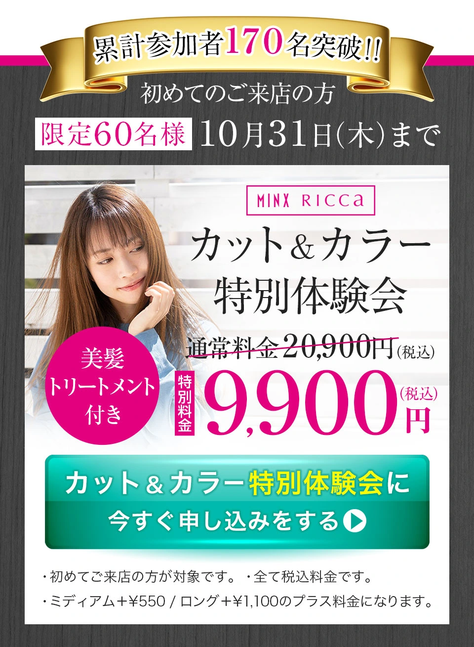 カット&カラー特別体験会は10月31日(木)まで限定60名様です。