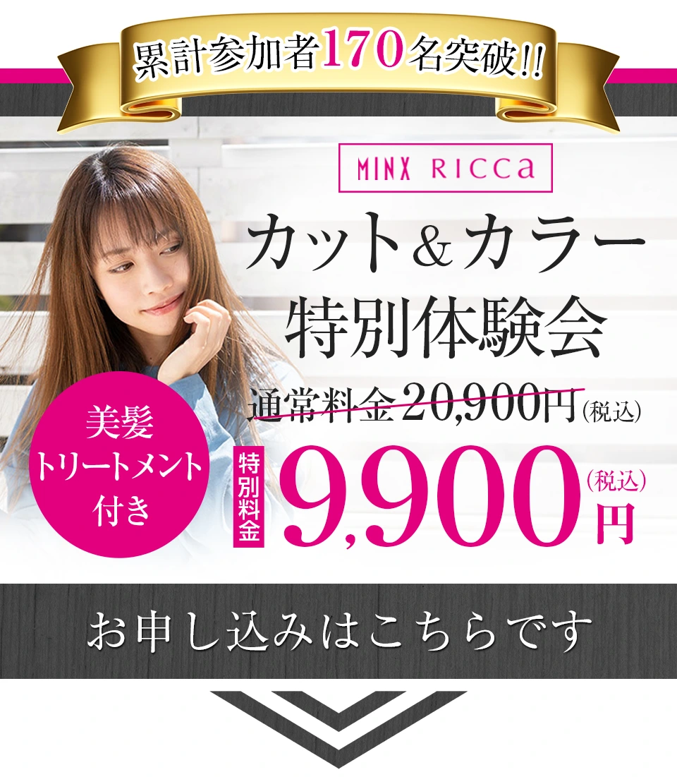 にお電話ください。「MINX RICCaです」と応対しますので、「カットとカラー特別体験に申し込みたい」と言ってください。